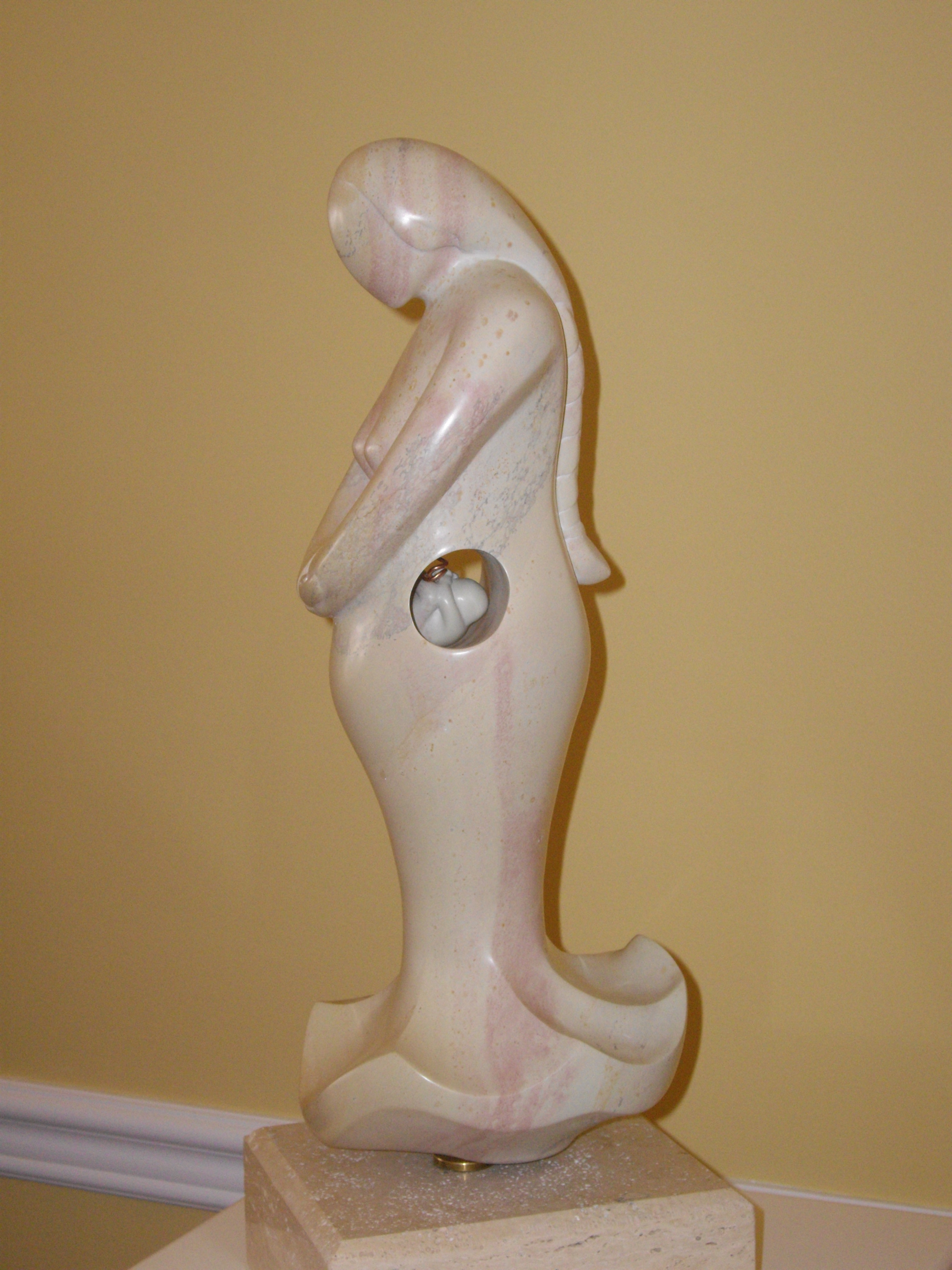 Deux matériaux sont utilisés dans les cimetières pour leur pérennité: la pierre et le bronze. Lise Deschatelets utilise ces mêmes matériaux pour exprimer, cette fois, la pérennité du cycle de la Vie. Avec modernité, l’artiste a réinventé le thème de la mère et l’enfant.